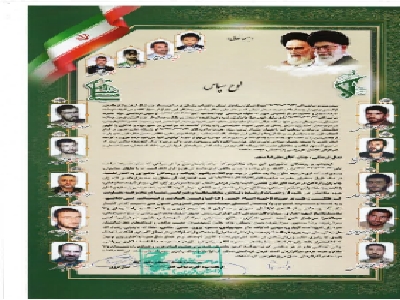 اینجانب و رزمندگان عاشورایی این سپاه مفتخریم که حیات پاسداریمان را سپاهی که به نام حضرت صاحب الامر مزین گشته و در رکاب نایب برحقش امام خامنهای عزیز قرار داده است ما با دلهای مطمئن و مصمم ایستادیم تا زمینه سازان ولایت عظما در چله دوم انقلاب باشیم. جانبازان و آزادگان در عرصههای دفاع مقدس امنیت پایدار مردمی شمال غرب با سردار پرآوازهاش سردار شهید جعفرخانی با اتصال به بدنه پایان ناپذیر بسیجش مدافعان حرمش با ستاره پر اقبالش سردار شهید حمید محمدرضایی و سفید پوشان جبهه سلامتش میباشد از زحمات ارزنده، تلاش مجاهدانه و همراهی شما در مجموعه معاونت هنری سپاه ناحیه امام حسن(ع) قزوین تقدیر و تشکر مینمایم.